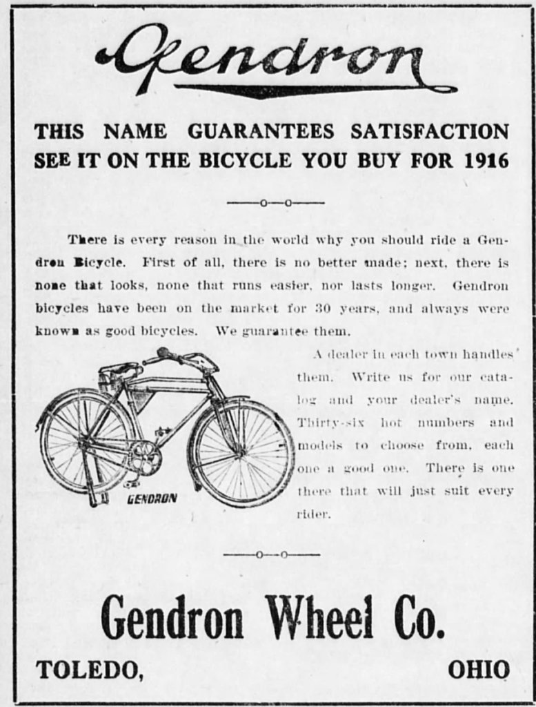 Even before Toledo, Ohio had a reputation for producing automobiles, it hosted many different industries, including Gendron Wheel Co.. Founded in 1872 in Toledo, Ohio by Pierre “Peter” Gendron, they produced bicycles and tricycles amongst other things. The company is still around making medical equipment out of Doraville, Georgia.