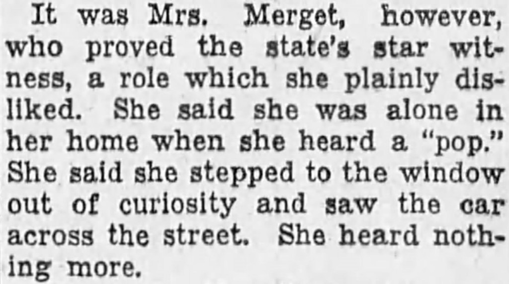 Thekla Merget testified further that directly after the “pop” sound, Alvera came to the Merget residence and stated “I’ve shot Fred. Come over and look at him.” Thekla said she declined the invitation “because she didn’t like to see dead people.” Thekla explained this this was 15 minutes or more before the police had arrived at the scene. She also said that she had seen Fred when he returned home and he didn’t seem to be intoxicated. Thekla stated that she had seen the “mystery” car at the Schlosser residence frequently. When asked if she knew the owner, she said no.