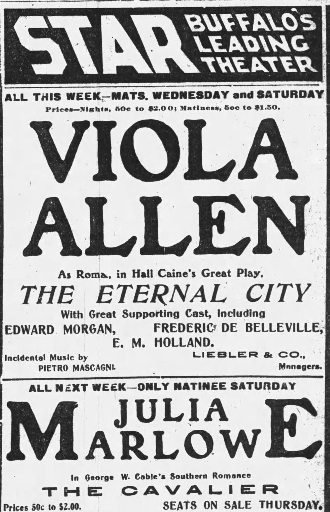 Two extremely talented actresses performing in Buffalo in 1903. Allen (1867-1948) was born in Alabama, but moved to Boston and then Toronto, and settled in New York City as a child. She was active as a performer from 1882-1919. She even acting in a few silent films.