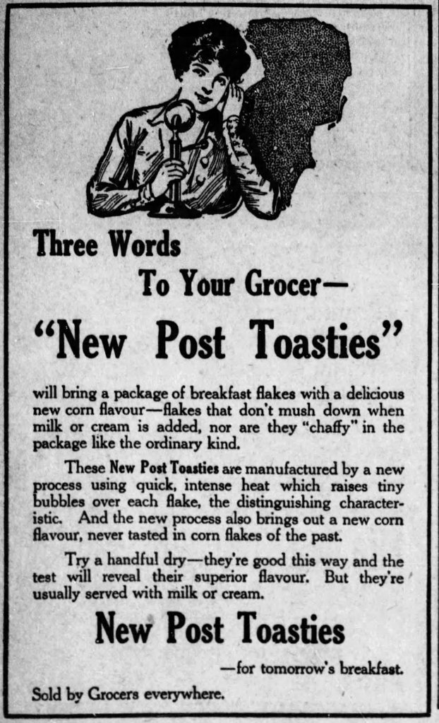Please don’t forget to eat your Post Toasties! I’m not sure how long Post made these, but they had a good run. A great knock-off of Kellogg’s Corn Flakes.