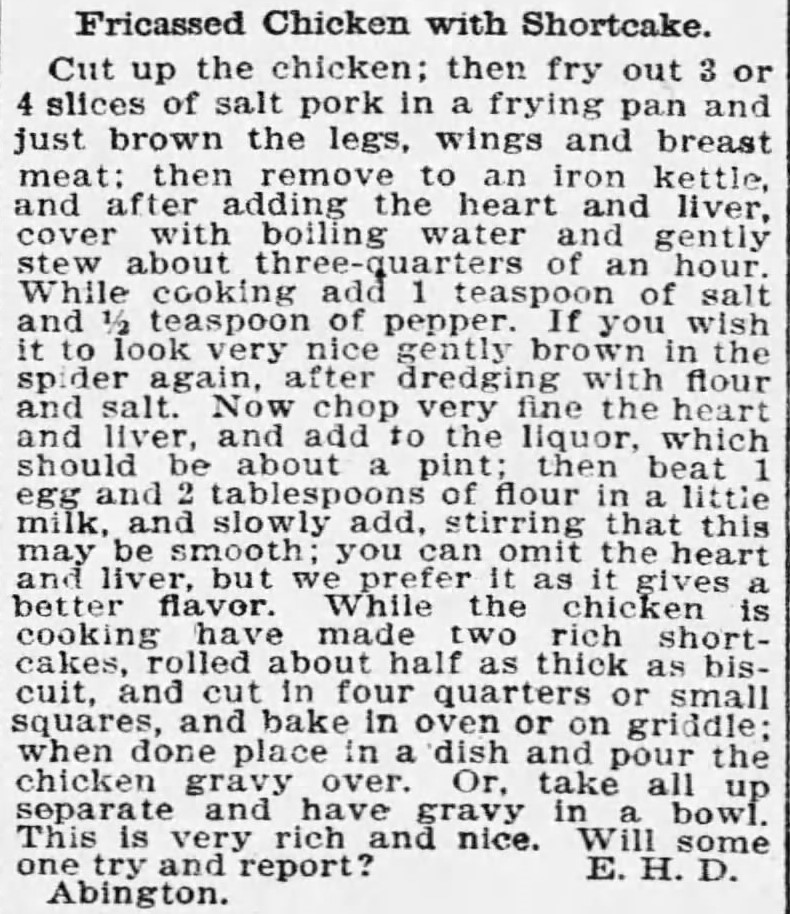 Fricassed Chicken with Shortcake Recipe, The Boston Globe (Boston, MA), March 27, 1895