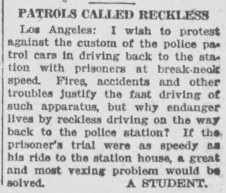This 1924 “Letter to the Editor” has a valid concern. One wonders how long it took for the speeding police to slow it down or if the practice ever stopped.
