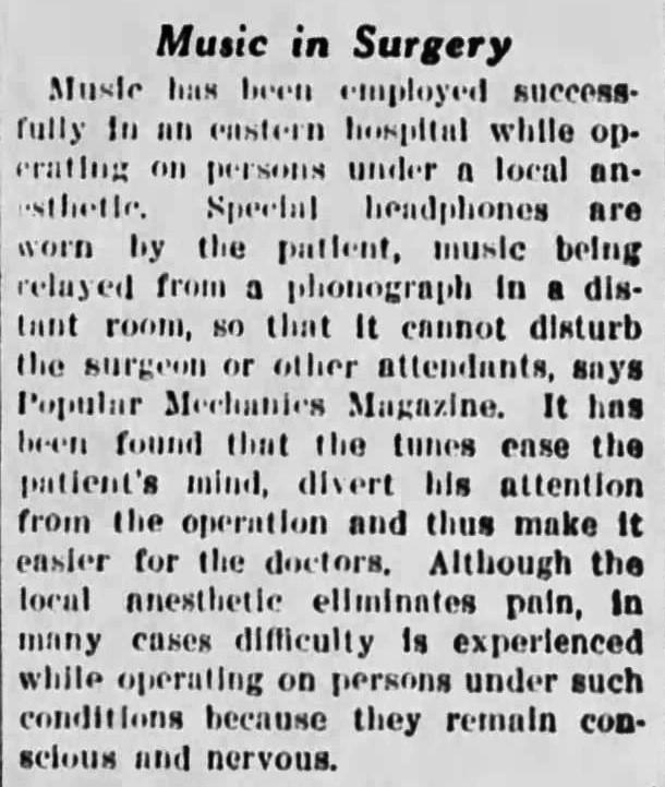 Music in Surgery, The Billings Times (Billings, Montana), June 9, 1927