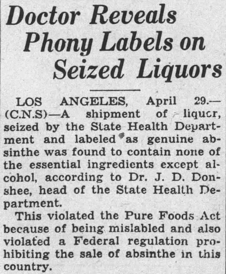 Doctor Reveals Phony Labels on Seized Liquors, The Long Beach Sun (Long Beach, California), April 30, 1934