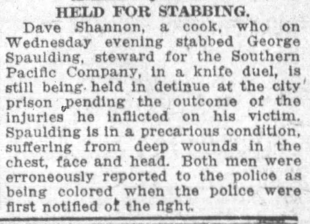 The 38 year old New York native, George C. Spaulding, was working as a steward on the same train as Dave Shannon. There is pretty scant information available on George C. Spaulding. However, it’s very clear that George was severely stabbed with a butcher knife and finally succumbed to his wounds on September 3, 1915 in San Francisco, California.