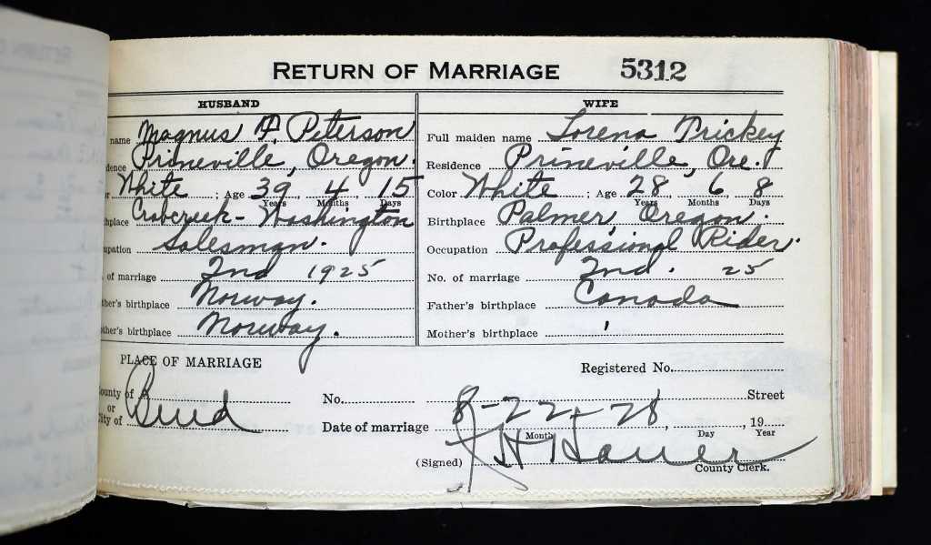 On August 22, 1928, Lorena married Magnus Frederick “Pete” Peterson in Bend, Deschutes County, Oregon. The wedding was attended by a few selected friends, sans cowboy attire, who met at the Justice of the Peace’s office to witness the marriage. Afterward, Magnus and Lorena took off in their automobile to honeymoon in parts unknown, however some thought they were headed for Montana, where Lorena had several rodeos to compete in.