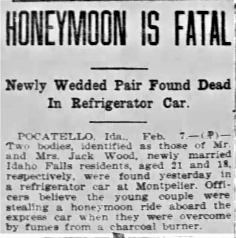Warning: this is a tragic story. Early on the morning of February 5, 1923, the lifeless bodies of 2 people were found in a potato train car, #16841, owned by the Pacific Fruit Express at the in Montpelier, Bear Lake County, Idaho. At first the bodies were not identified, by police investigators soon identified them as Jack Wood, age 26 and his wife Callie L. (Colson) Wood, age 18, living in Pocatello, Bannock County, Idaho at the time of this incident. The coroner of Bear Lake County at the time, F.M. Williams, soon returned a cause of death for both of the deceased as “Asphyxiation from charcoal gas fumes.” They had been using a charcoal burning heater in the train car. The train car was fitted with this heater to keep the potatoes it was hauling from freezing in the winter cold. Sad and accidental.
