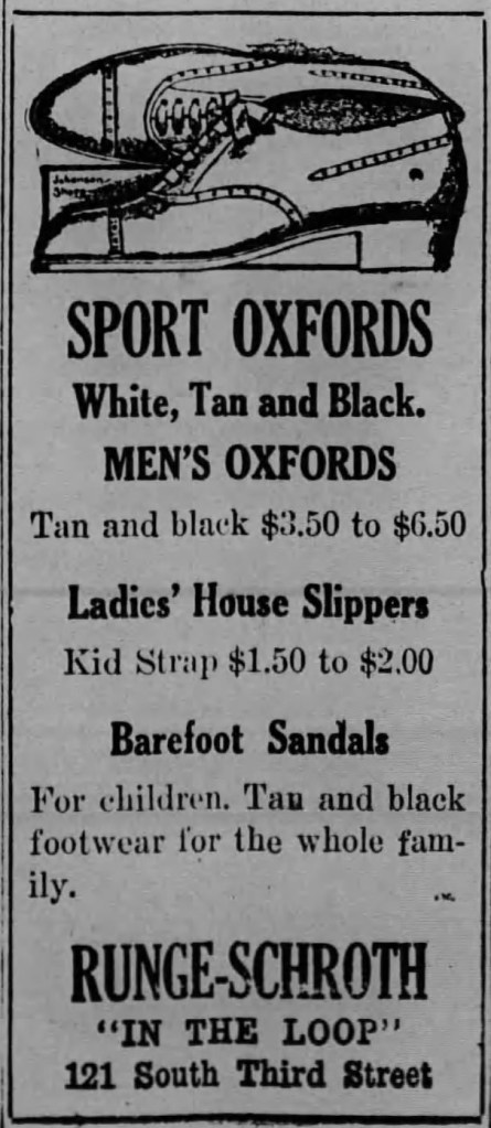 Did you know that the Oxford style shoe is distinguished by a closed-lacing system, basically meaning that the lace eyelets are placed underneath the facing of the shoe? That said, I’d love to pay those prices for shoes now. Although, that was a lot of money for the time. A pair of those Oxfords with all the bells and whistles, the $6.50 pair, would be the equivalent of paying about $166 today. The dream of paying $6.50 for a roughly $160 pair of shoes doesn’t change. If you’re ever in Paducah, Kentucky, stop by 121 South Third Ave. and remember that in 1917 there was a shoe store there. The same building still stands there, however, it is a clothing store now.