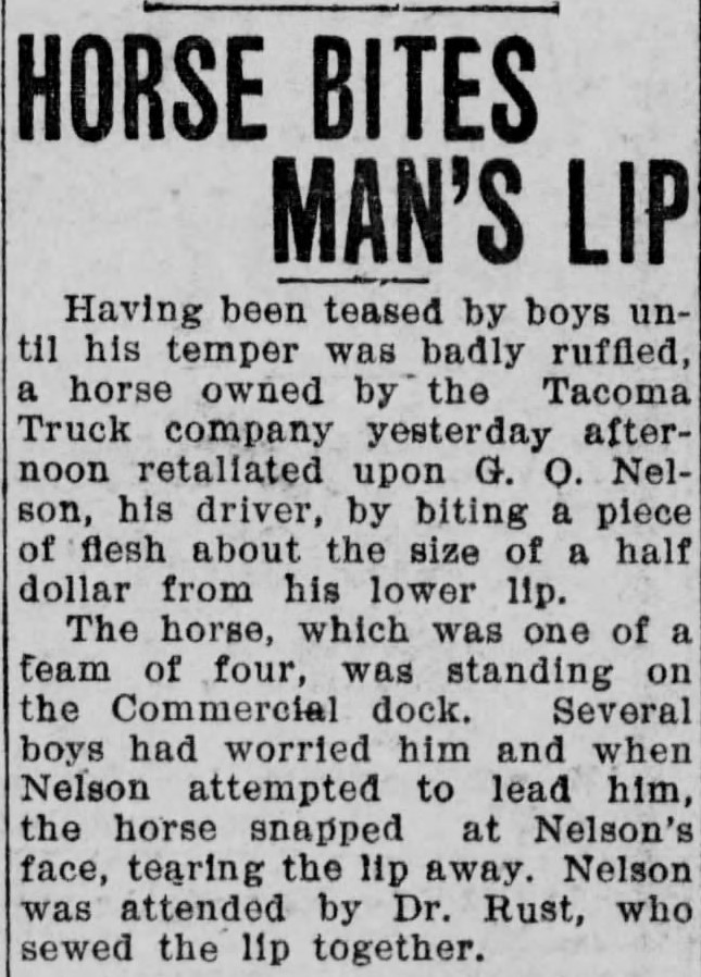 Horse Bites Man’s Lip, The Tacoma Times (Tacoma, Washington), May 18, 1907