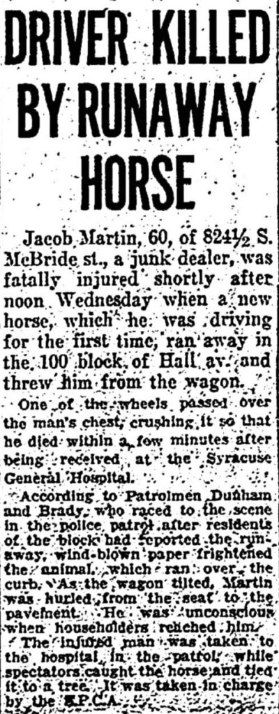 Driver Killed By Runaway Horse, Syracuse Herald Journal (Syracuse, New York), April 22, 1931