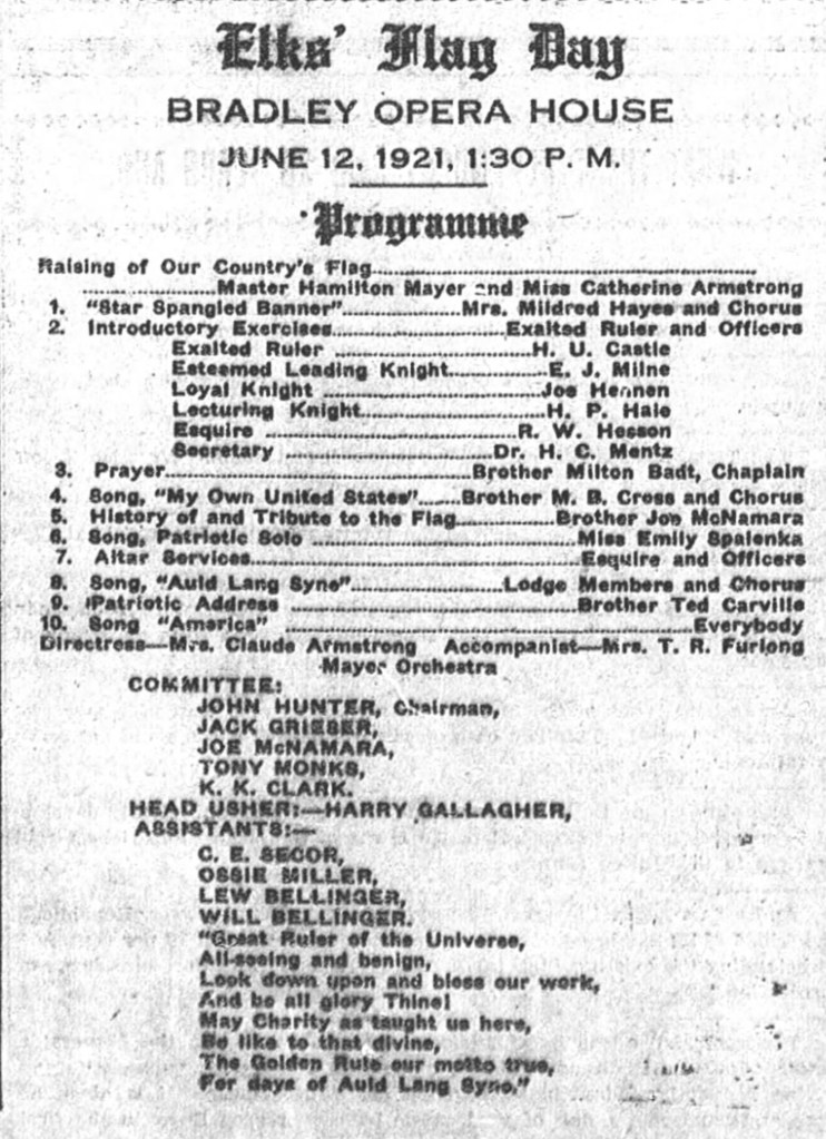 On, June 12th, 1921, the Elks Lodge in Elko, Nevada held a program to celebrate Flag Day. It was held in the Bradley Opera House, We would have researched the fate of the Bradley Opera House, however the Elko Free Press is behind a paywall and we don’t really have any reason to subscribe to it currently. (We suppose that makes the Elko Free Press not actually free at all. Ba dum tss).