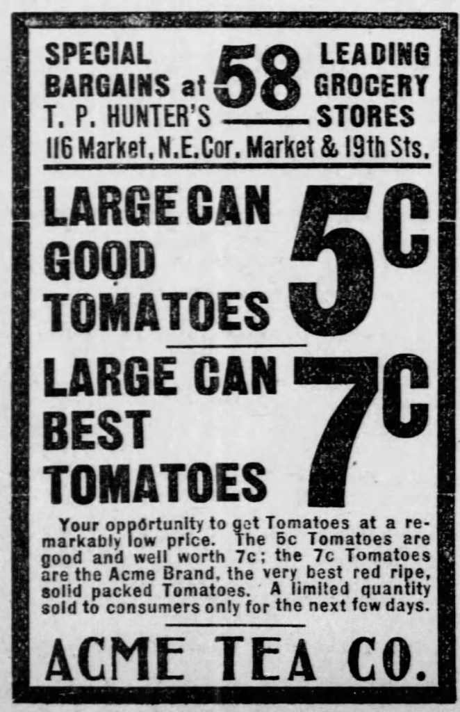 Originally started by Irish immigrant Thomas Pattison Hunter (1861-1915) on Germantown Avenue, Philadelphia, Philadelphia County, Pennsylvania in 1885, The Acme Tea Company soon swelled into many more stores throughout Philadelphia. This particular store mentioned in the above advertisement was located at the N.E. corner of Market and 19th Streets. The 1835 Market building stands in it’s place now. By the time Mr. Hunter died in 1915, Acme Tea Company had about 400 stores. Not too shabby for 30 years worth of work.