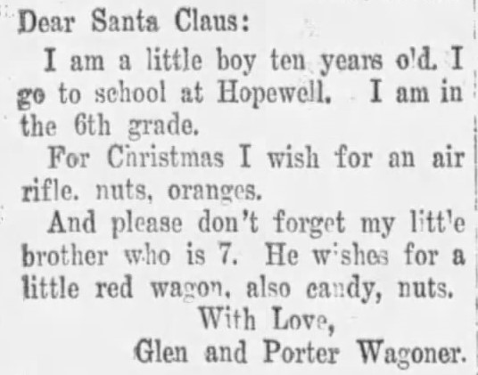 Even the Country Music legend Porter Wagoner (1927-2007) was a child once, a child with a big brother who wished for Santa Claus to bring Porter a little red wagon, candy, and nuts. Porter’s big brother Glenn Lee Wagoner died of septic pericarditis and acute rheumatism (per death certificate) at the age of 18 on August 28, 1942. What a difference eight years can make for someone. And, as many of us know, Porter became a Country Music singer and enjoyed many top of the chart hits, both as a solo artist and also when he teamed up with Dolly Parton. Dolly has been quoted many times saying that her smash hit “I Will Always Love You” was about her professional breakup with Porter and her words reflected her wish for them to move on with respect and admiration. That is one of many things that makes Dolly a legend too. How could somebody not love Dolly?