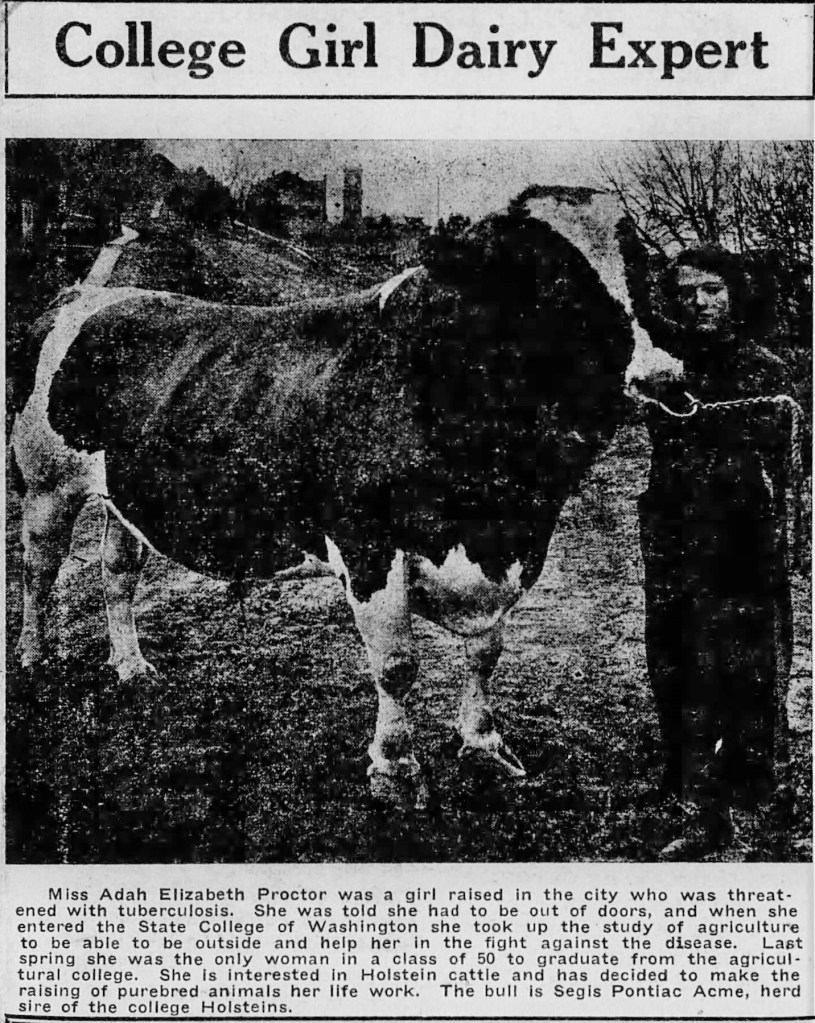It is unknown where Adah or any of her siblings received their educations or were housed between 1910 and 1920, but in 1920, Adah is listed as living as a boarder in the home of the Daniel Trefethen family in the West Queen Anne neighborhood of Seattle. Nice neighborhood, then and now. How she came to live with that family is unclear, however it wouldn’t be long before she enrolled in the State College of Washington (later the Washington State University) in 1920. Her goal, as mentioned in the above article, was to learn more about raising purebred animals, especially Holstein cows. She graduated in 1924 with a degree in Agriculture. She made animals, especially all breeds of cattle, her focus and she graduated high in her class.