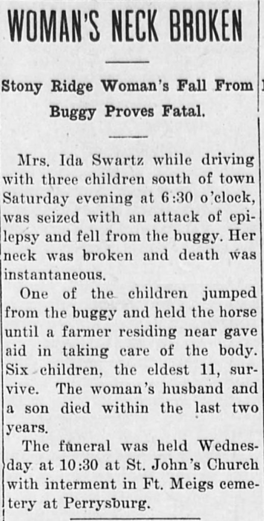 On April 4, 1914, tragedy struck when Ida was driving a horse and buggy with three of her children as passengers. Apparently, Ida suffered an epileptic seizure and fell from the buggy. She suffered a skull fracture and probably a broken neck in the fall. She was 35 years old. Those poor children. She was laid to rest at Fort Meigs Cemetery in Perrysburg, Wood County, Ohio. She was buried in the same lot as her husband and child, Floyd.