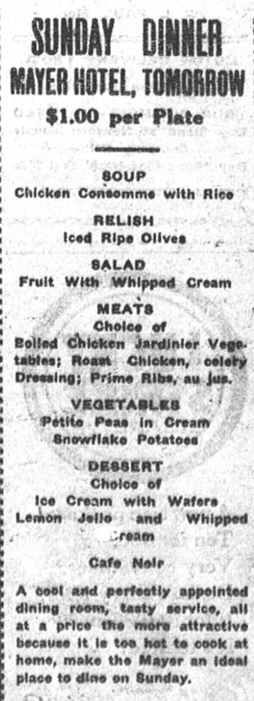 To us, this menu doesn’t sound too horrible, but it also wouldn’t be on our everyday choice. Fancy chicken and rice soup? Check. Mmm olives. Check. Maybe just fruit without the whipped cream. Thanks. Also, the prime rib sounds tasty, pass on the peas, and the snowflake potatoes (fancy mashed potatoes with cream cheese, sour cream and various spices) sound quite nice. No jello, please. Ice cream, hold the wafers. Sounds like a good deal and in a Elko, Nevada hotel to boot. A 1921 dinner doesn’t sound too bad, although, it does leave one to wonder what they had to drink with dinner.