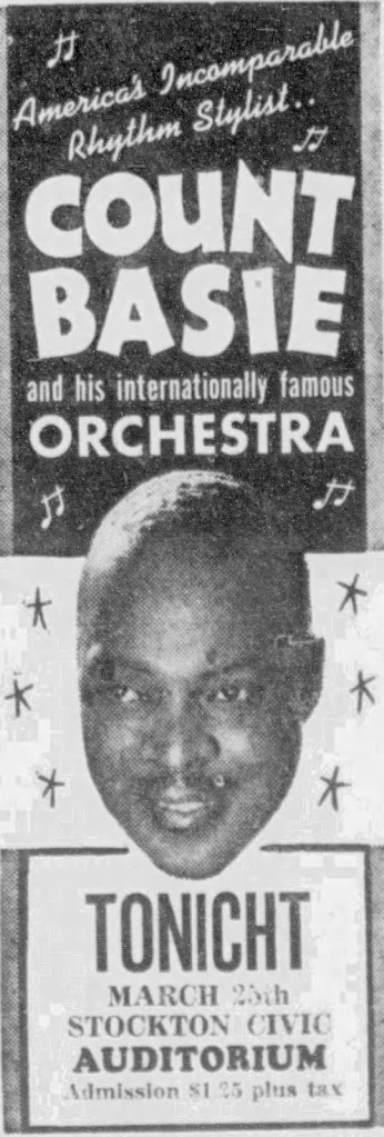 What about the venue? Is it the Stockton Civic Auditorium still standing? It sure is (also called the Stockton Memorial Civic Auditorium). It’s located at 525 North Center Street in the Civic Center area of Stockton, Kern Co., California. Opened in 1925, the auditorium was funded by a bond drive to honor those who served and/or died while serving in the Armed Forces in The Great War (WWI). Seating approximately 5,000, the venue has hosted many sports events and concerts including, Carlos Santana, The Grateful Dead, Rush, the Blue Oyster Cult, The Golliwogs (AKA the band that became Creedence Clearwater Revival), and of course, Count Basie, among others. Maybe there will be a 100th anniversary celebration for the auditorium next year. That would be cool.