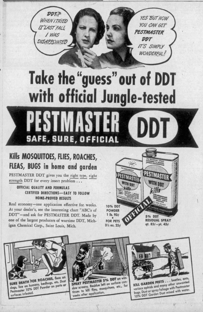 Dichlorodiphenyltrichloroethane, better known as DDT, was arguably one of the best pesticides ever. By the time the above advertisement was released, DDT had only been approved for sale in the United States for less than a year. Even though DDT was a good pesticide, It was deemed harmful to the health of human beings, animals, and the environment and was taken off the market and banned in the U.S. in 1972. It is still used in many countries still, especially in the fight against malaria infected mosquitos.