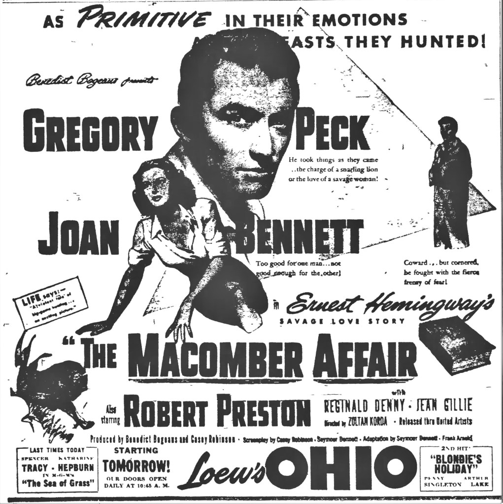 It’s movie time! The Zoltan Korda (born Zoltan Kellner; 1895-1961) directed drama film The Macomber Affair was released in April 1947 and starred one of the Golden Age’s most popular leading men: Gregory Peck (born Eldred Gregory Peck; 1916-2003) and his rugged good looks. Also appearing in this movie, Joan Bennett (1910-1990), Robert Preston (born Robert Preston Meservey; 1918-1987), Reginald Denny (born Reginald Leigh Dugmore; 1891-1967), and Jean Gillie (born Jean Mabel Coomber; 1915-1949), in final film before her untimely death at the age of 33. The film was adapted from Ernest Hemingway’s short story, “The Short Happy Life of Francis Macomber.” Set in Africa, the story follows Margot (the scorned woman), her husband, Francis (the abusive a$$hole), and Robert (the big game-hunter.) The movie did pretty good at the box office and the critic’s loved it. So did Papa. He always liked a good safari. Check the film out sometime, it’s good. Oh, and read the short story, it’s very good.