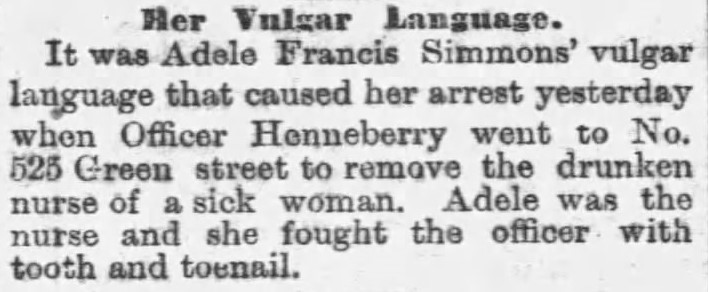 Once again, one has to wonder what “vulgar language” would be considered in 1883, let alone when uttered by a woman (this is sarcasm). Not much can be found about her, but we leave this article with this: Go Adele!