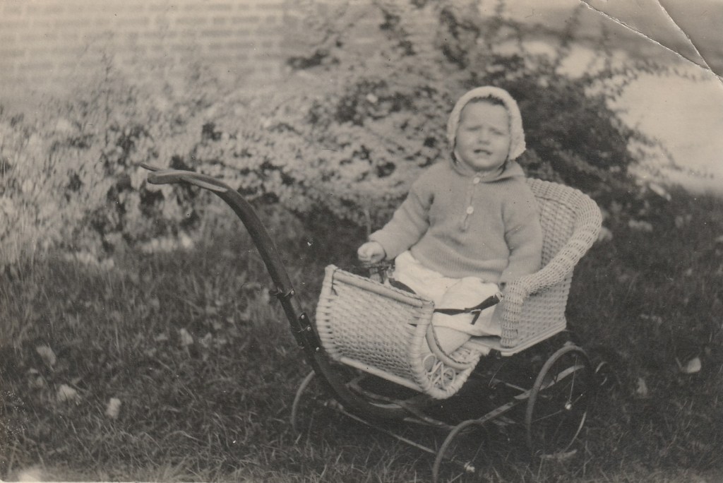 This photograph has nothing written on the back. No name, no date, no location. Obviously, finding the name and location is moot, but it appears that this photo was taken sometime between 1920-1945. That is a guess. The baby carriage seems like it may be little older than that, maybe a hand- me-own. Regardless, that is a cute kid.