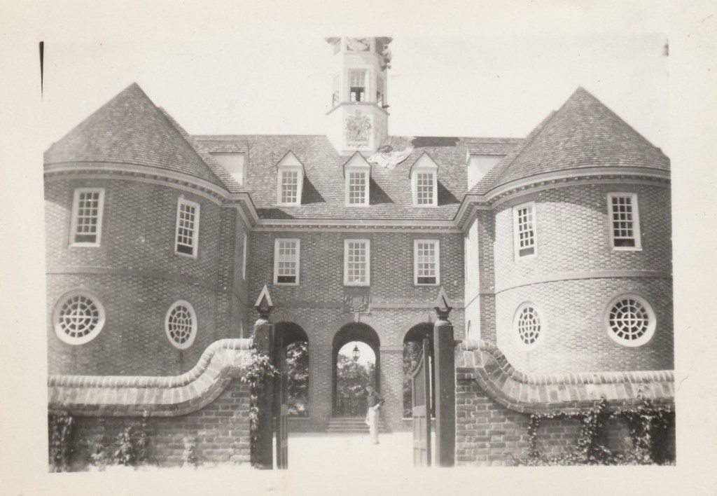 Located in Williamsburg, Virginia, stands a reconstruction of the original capitol building that housed the Colony of Virginia government from 1705-1747. This photograph shows the reconstructed building which was opened in 1934 and was part of the revitalization that lead to the creation of “Colonial Williamsburg.” To this day, the building, stone fence, and gates still look the same. We don’t know who took this picture, but we do know that this picture was taken in June, 1950, as it is written on the back of the photograph.