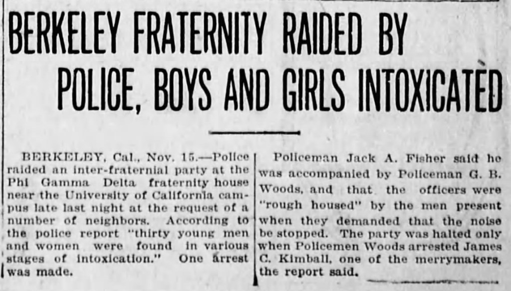 Of course they were intoxicated, it’s kind of a college rite of passage for some. And yes, drunk young people can get loud, but, so can anyone who has been drinking, regardless of age (Sorry, the reported is a little harsh to me). This happened at the Phi Gamma Delta house at the University of California campus located at 2620 Bancroft Way, Berkeley (The house no longer stands and the huge Woo Hon Fai Hall sits in its place now.) One wonders exactly the what the phrase “rough housed” means. Not what the term means, which is understood, but the context it is used. Was it justification for the police to act tough (it doesn’t say that the cops were the rowdy ones, but they are often reactionaries)? We will probably never know. So the intoxicated partygoers calmed down when one one partaker of mind-altering substances, James C. Kimball (sp), was arrested. What happened to Mr. Kimball (sp)? Well, when all this stuff boiled down, James Clinton Kimble was a 20-year-old sophomore in the geology program at UNC-Berkeley. It is unclear what the repercussions of his arrest was, but he was “absent on leave” from the university at some of his junior year. He graduated in 1926. He was married a couple times and had several children. He worked as a geologist in the oil/petroleum industry until the late 1960s. He died in 1991 at the age of 87 in California. Wish we could find out more information on him, like what he was charged with in 1924 (although one could think of a few charges that they would have leveled), and what was his punishment? If the family of James knows anything and would like to fill us in, please let us know in the comments below. Moving along…