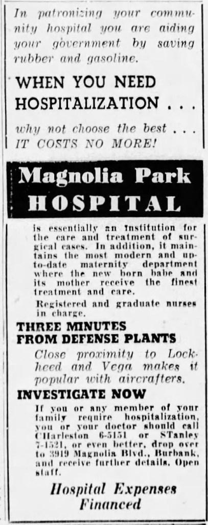 Magnolia Park Hospital Advertisement, North Hollywood Valley Times (North Hollywood, California), February 12, 1943