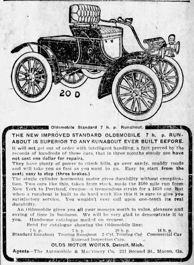 Olds Motor Works Advertisement, The Macon Telegraph (Macon, Georgia), August 27, 1905